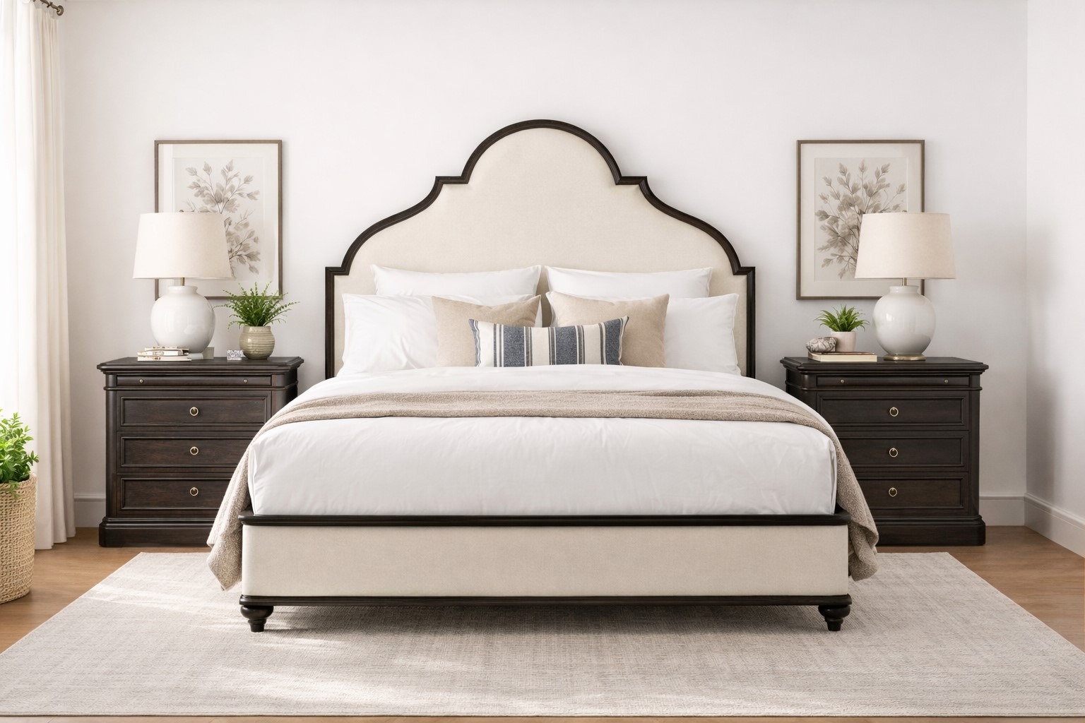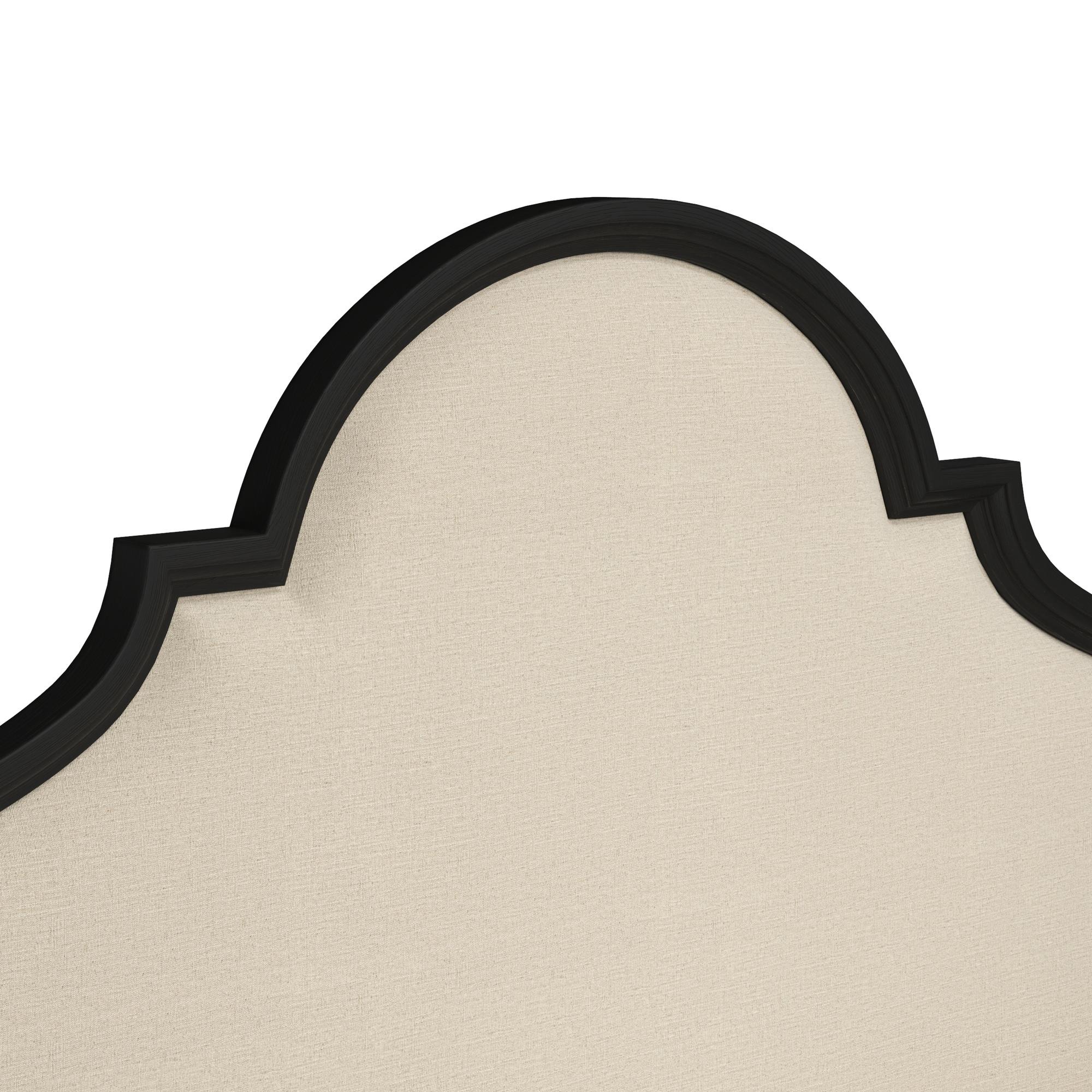 Traditional style steps into the 21st century. Inspired by the neoclassical influence of Louis XVI-era France, the Atrium Panel Bed features scrolled arches with notched corners and turned wood feet that evoke a sense of history. Sleek upholstered panels and solid wood frame with rustic hand-glazed blackened finish give this showstopping bed a modern aesthetic combined with timeless elegance.